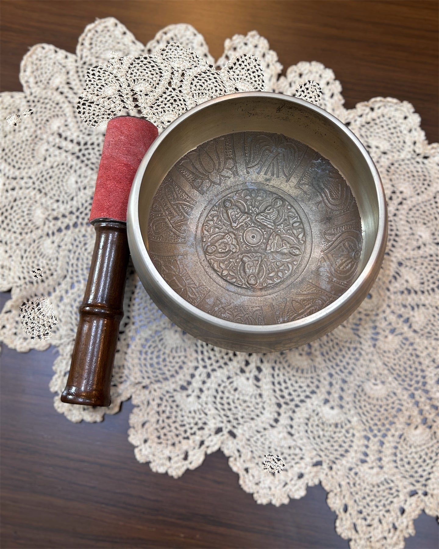 This heavy and pure brass singing bowl produces a rich, soothing tone ideal for healing and therapeutic practices. Paired with a finely crafted wooden mallet, it offers a beautiful experience for meditation, sound therapy, and relaxation. Its enraved design ensures both aesthetic appeal and functional excellence.